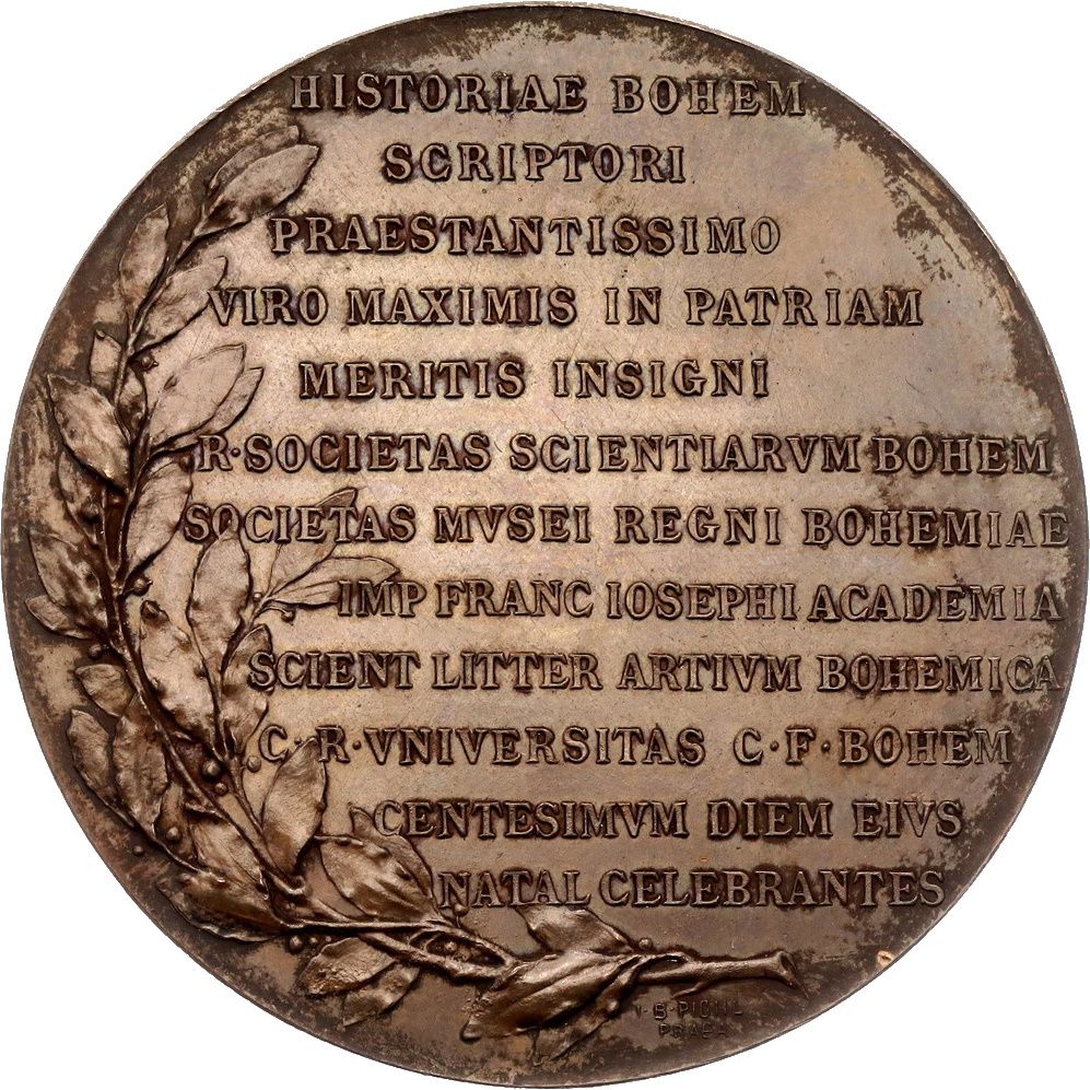HISTORIAE BOHEM SCRIPTORI PRAESTANTISSIMO VIRO MAXIMIS IN PATRIAM MERITIS INSIGNI R · SOCIETAS SCIENTIARVM BOHEM SOCIETAS MVSEI REGNI BOHEMIAE IMP FRANC IOSEPHI ACADEMIA SCIENT LITER ARTIVM BOHEMICA C · R · VNIVERSITAS C · F · BOHEM CENTESIMVM DIEM EIVS NATAL CELEBRANTES