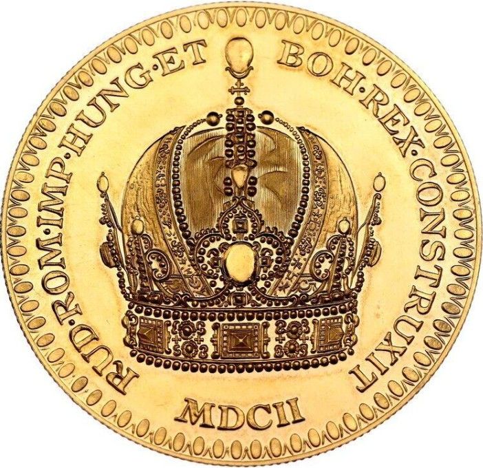Опис: Багато прикрашена корона, що належала Рудольфу II, навколо — напис, а внизу — дата римськими цифрами.