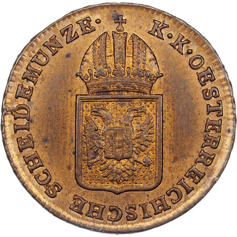 Опис: Коронований щит Австро-Угорської імперії, оточений написом: «Kaiserliche und Königliche Östereichische Scheidemünze» (Імператорська та Королівська Австрійська, Scheidemünze — монета, номінальна вартість якої перевищувала вартість металу).