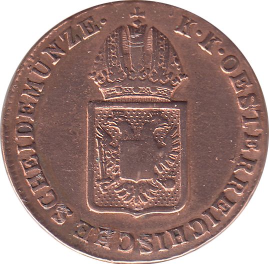 Опис: Коронований щит із імператорським двоголовим орлом, на грудях герб Австрії. Напис навколо «Kaiserliche und Königliche Östereichische Scheidemünze» (Імператорська та королівська австрійська, Scheidemünze — це звичайна монета, метал якої коштує менше, ніж номінальна вартість).
