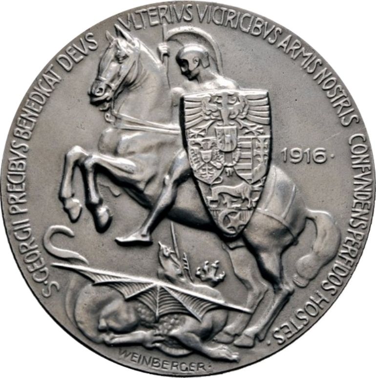 Опис: Святий Георгій, що вбиває дракона, з великим щитом, на якому зображені 4 герби союзних країн.