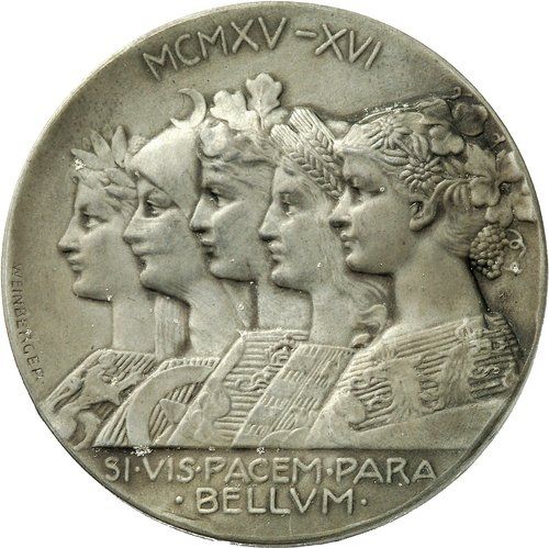 Опис: П'ять портретів бюстів жіночих персоніфікацій союзних країн у геральдичному вбранні та з прикрашеним волоссям, розташованих в лівому боці.