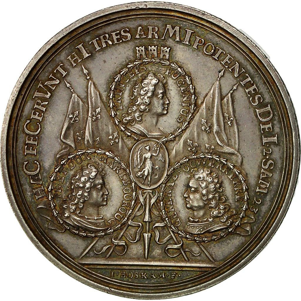 Опис: Портрети принца Євгенія, герцога Мальборо та маршала Д'Уверкерке над чотирма французькими прапорами, у центрі — Перемога.