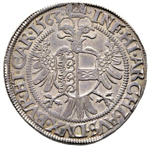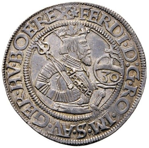 Опис: Портрет Фердинанда I у піврозмірі, у короні, в обладунках і з бородою, звернений праворуч, зі скіпетром у правій руці та державою з номіналом у лівій руці. Безперервний напис (починається о 12 годині).