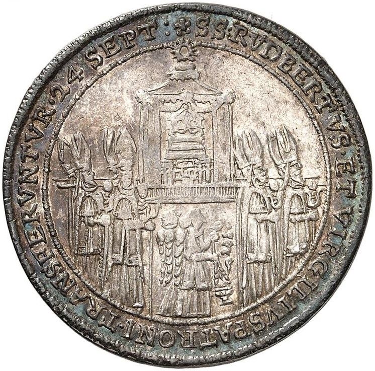 Опис: Єпископи, що несуть реліквію в облямованому намистом колі, перенесення реліквій святих Руперта та Віргілія 24 вересня 1628 року. Легенда навколо (починається о 12 годині).