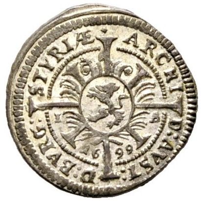 Опис: Щит Штирії над двома кутовими хрестами, менший у колі, більший розділяє легенду. Дата та знак монетного двору розділені хрестом.