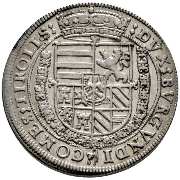 Опис: Великий щит з короною та композиційним гербом, що включає 1 Угорщину, 2 Богемію, 3 композицію Кастилії та Леону, 4 Австрію та Бургундію. Над короною та навколо ланцюга ордена Золотого руна, у центрі — маленький щит Тіролю. Напис навколо починається о 2 годині. Внутрішнє коло з намистинами.