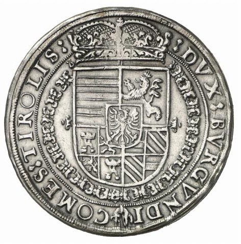 Опис: Великий коронований щит із композиційним гербом, що включає 1 Угорщину, 2 Богемію, 3 композицію Кастилії та Леона, 4 Австрію та Бургундію. Над короною та навколо ланцюга ордена Золотого руна. Напис навколо починається з 2h. Внутрішнє коло з намистинами.