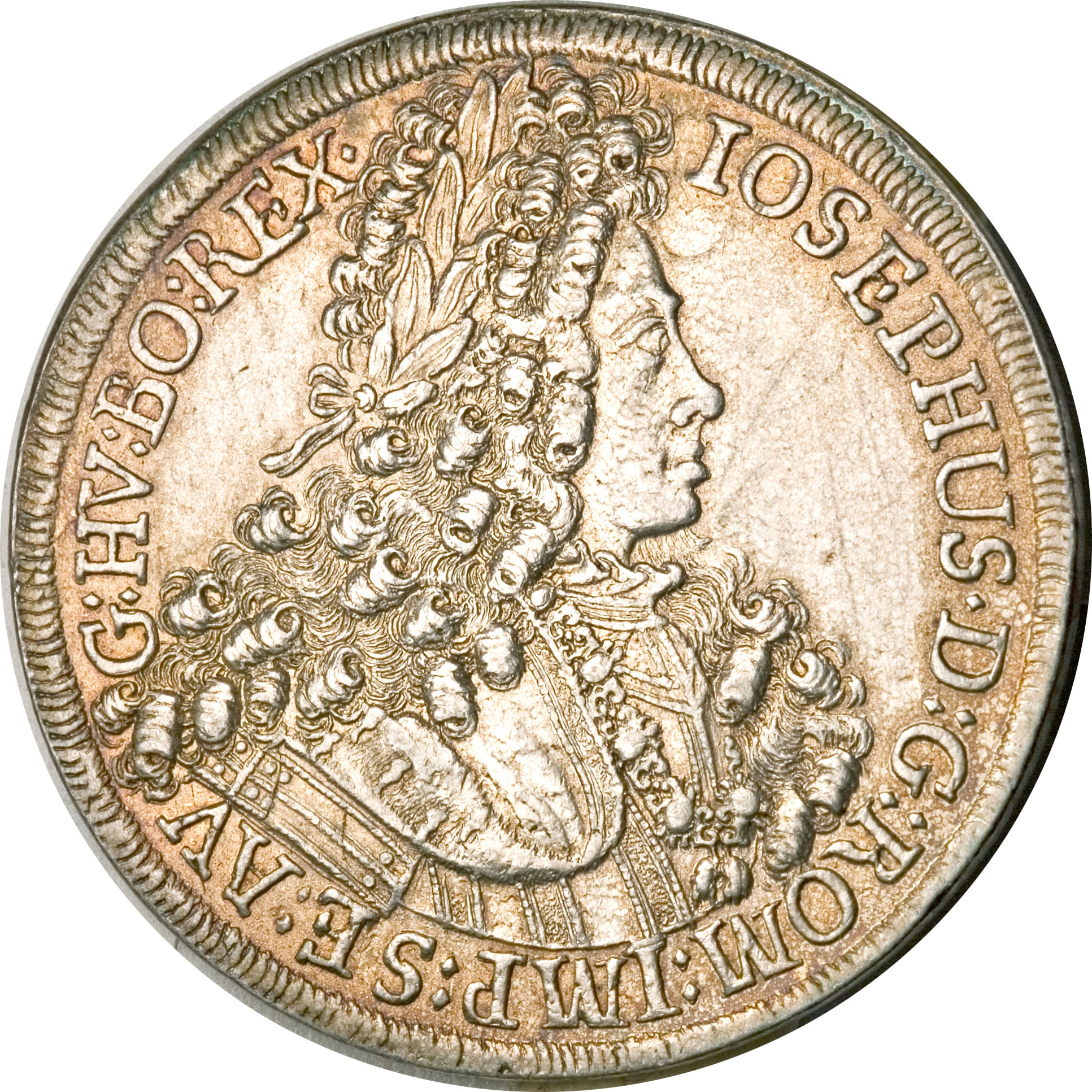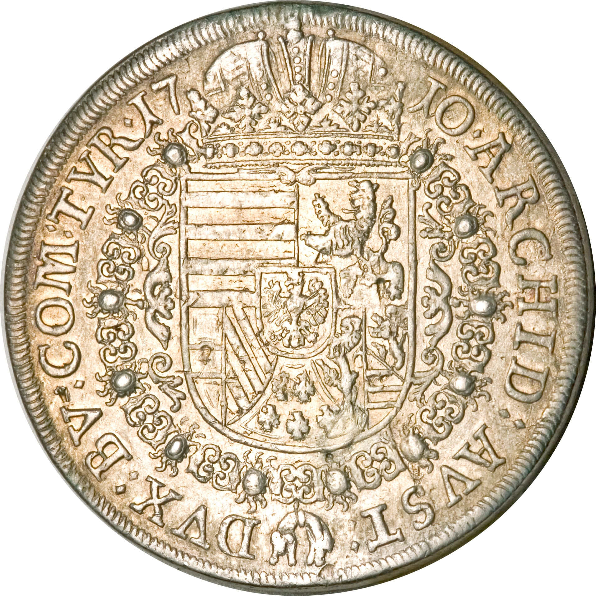 Опис: Портрет у обладунках із кучерявою перукою, звернений праворуч, ланцюг ордена Золотого руна на грудях. Верхня частина голови розділяє легенду. Внутрішнього кола немає.