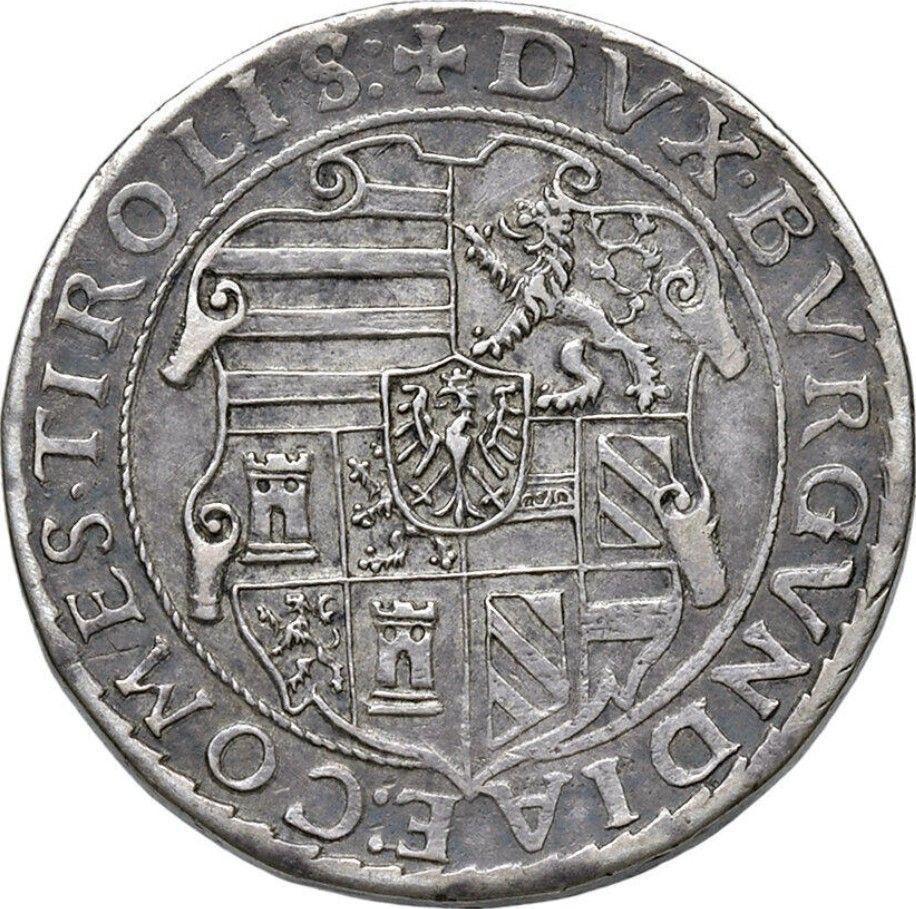 Опис: 3 бюсти, звернені вправо, Максиміліана I, Карла V та Фердинанда I в коронах, з ланцюгом ордена Золотого руна, всередині внутрішнього кола з намистинами. Напис навколо (починається о 12 годині).