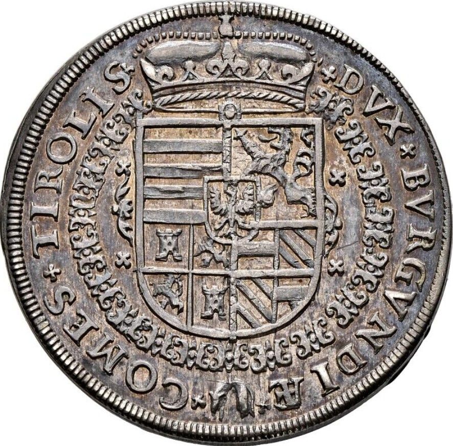 Опис: Композитний герб у коронованому щиті, що включає 1 Угорщину, 2 Богемію, 3 композицію Кастилії та Леону, 4 Австрію та Бургундію, з невеликим щитом Тіролю зверху, навколо ланцюга ордена Золотого руна у формі кола. Внутрішнє коло відсутнє. Напис навколо починається з 1h.