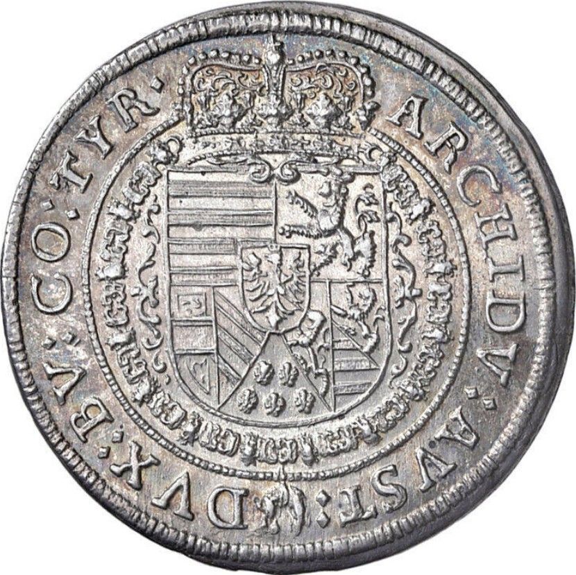 Опис: Коронований щит із композитним гербом, у центрі якого розташований невеликий щит Тіролю, оточений ланцюгом ордена Золотого руна, всередині внутрішнього кола з намистинами.