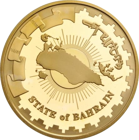 Опис: Бюст шейха Хамада бін Іса Аль Халіфа, еміра Держави Бахрейн, звернений вліво, в оточенні вінка. Напис арабською мовою внизу.
