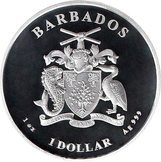 Опис: На аверсі зображено золотий герб Барбадосу з двома національними квітами Барбадосу — «Гордістю Барбадосу» та бородатим фіговим деревом. По боках герба зображено дельфіна, який символізує рибальську промисловість, та пелікана, на честь острова Пелікан. Над гербом зображено шолом та мантію. На вінку зображено руку та долоню баджанця, який тримає два перехрещених шматки цукрової тростини, що символізують цукрову промисловість. Герб має девіз «Гордість та працьовитість».