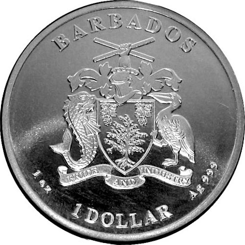 Опис: На аверсі зображено золотий герб Барбадосу з двома національними квітами Барбадосу — «Гордістю Барбадосу» та бородатим фіговим деревом. По боках герба зображені дельфін, що символізує рибальську промисловість, та пелікан, на честь острова Пелікан. Над гербом зображено шолом та мантію. На вінку зображено руку та долоню баджанця, що тримає два перехрещені шматки цукрової тростини, які символізують цукрову промисловість. Герб має девіз «Гордість та працьовитість».