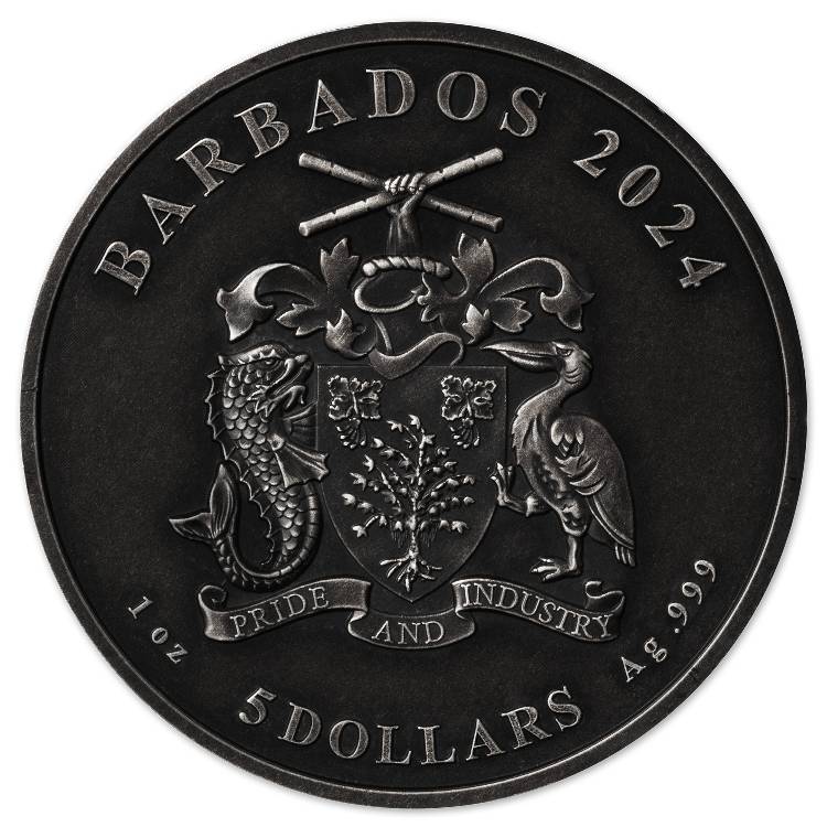 Опис: На аверсі зображено герб Барбадосу разом з написами: «BARBADOS 2024» — країна-емітент та рік, «1 oz» — вага, «5 DOLLARS» — номінал та «Ag .999» — проба срібла.