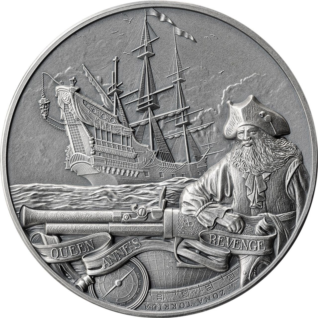 Опис: У центрі зображено череп з піратським капелюхом, ліворуч — герб. Над монетою вказано назву країни та номінал, під монетою — вагу, дату та пробу.