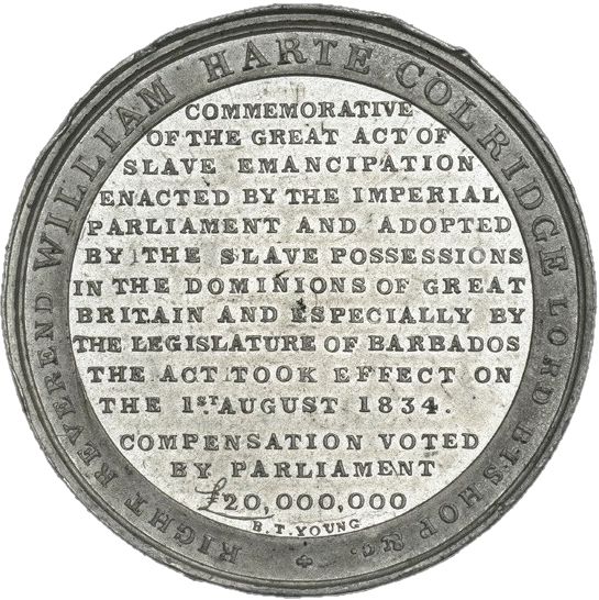 COMMEMORATIVE OF THE GREAT ACT OF SLAVE EMANCIPATION ENACTED BY THE IMPERIAL PARLIAMENT AND ADOPTED BY THE SLAVE POSSESSIONS IN THE DOMINIONS OF GREAT BRITAIN AND ESPECIALLY BY THE LEGISLATURE OF BARBADOS THE ACT TOOK EFFECT ON THE 1ST AUGUST 1834 . COMPENSATION VOTED BY PARLIAMENT £20,000,000