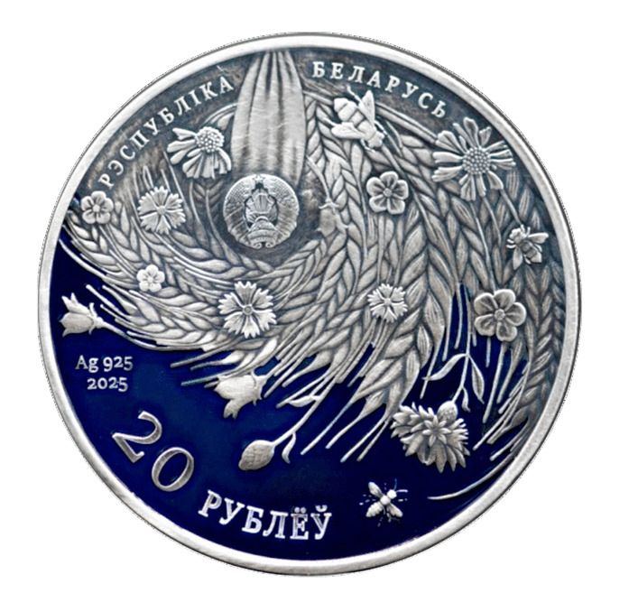 Опис: У центрі — рельєфне зображення Державного герба Республіки Білорусь на тлі колосків, квітів і неба.