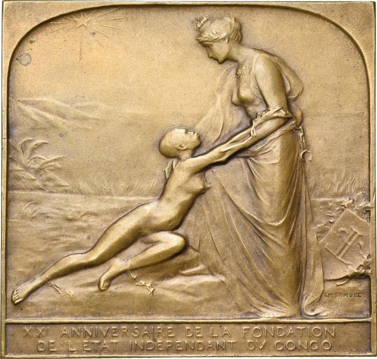 Опис: Алегорична жіноча фігура Бельгії стоїть і піднімає жіночу фігуру Конго, з якої зняті ланцюги.