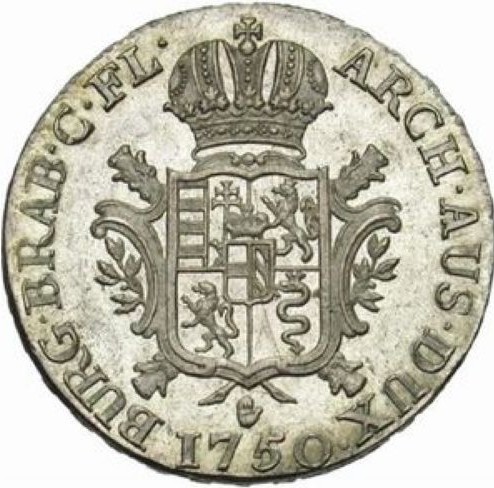 Опис: Коронований герб, розділений на чотири частини, невеликий коронований щит Австрії-Бургундії в центрі, в бароковій рамці, знак монетного двору та дата внизу.
