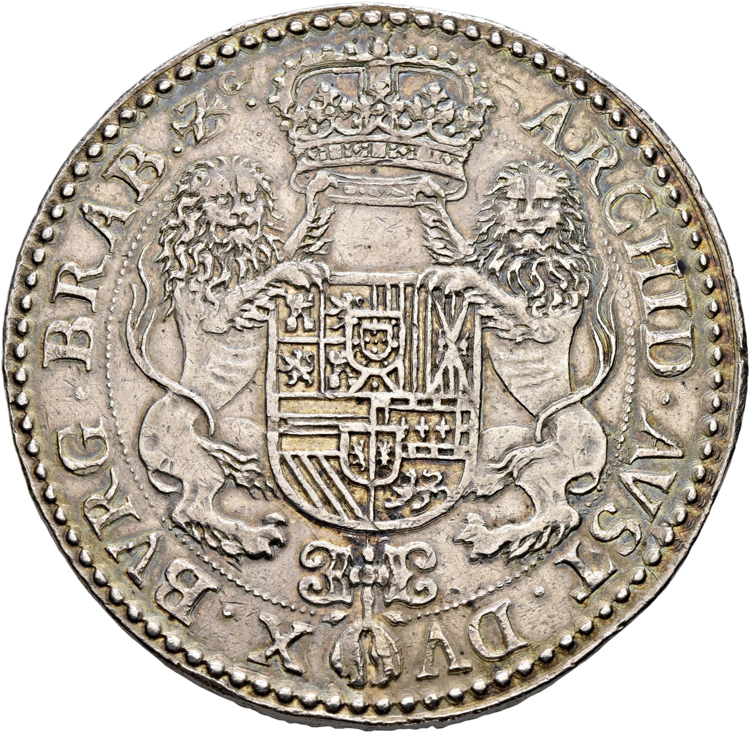 Опис: Бюст короля Іспанії Філіпа IV, звернений вправо, в обладунках з левовою головою на плечі, мантії, ордені Золотого Руна та високому комірі.
