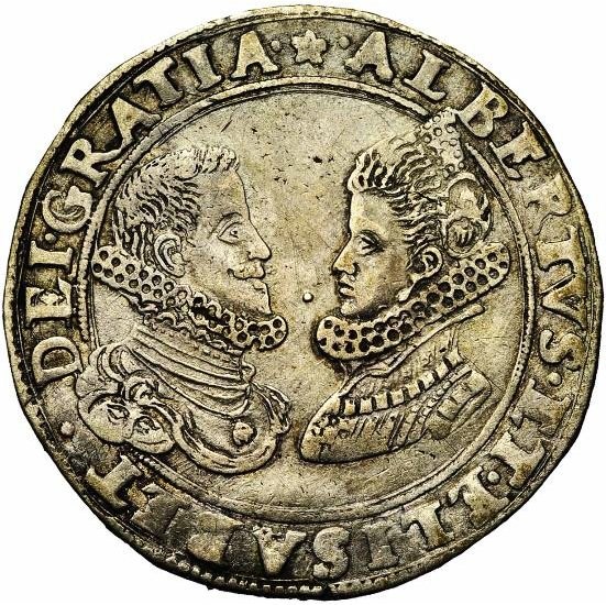Опис: Бюсти Альберта та Ізабелли, що дивляться один на одного. Зверху — знак монетного двору.