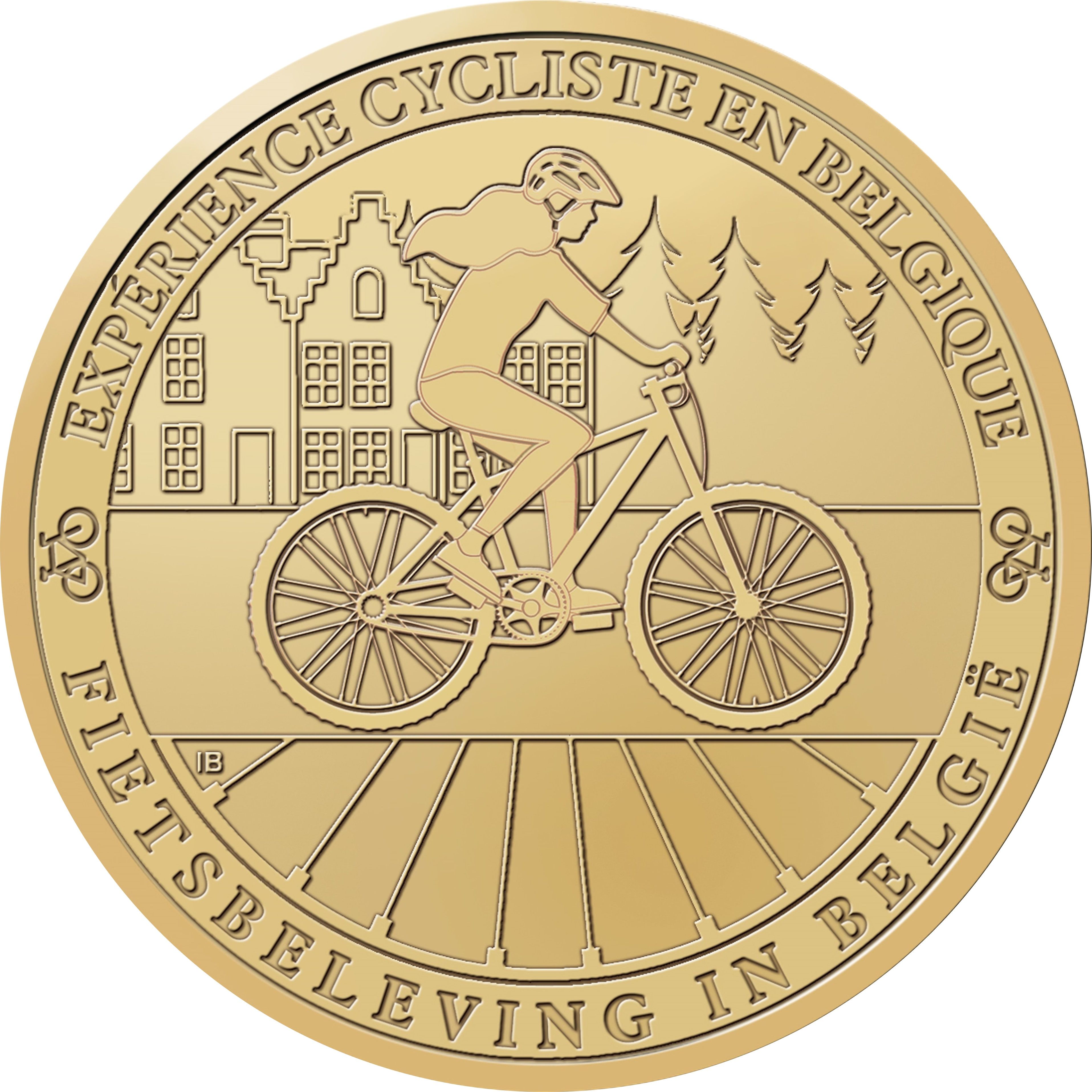 Опис: Спортивний велосипедист мчить бельгійським ландшафтом по доріжці, утвореній спицями. Все це оточене текстом: EXPÉRIENCE CYCLISTE EN BELGIQUE та FIETSBELEVING IN BELGIE і двома мініатюрними велосипедами.