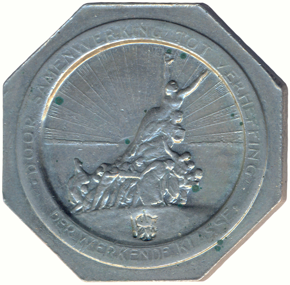 Опис: Алегорія сходу сонця за робітничим класом у обручі, оточеному легендою. Марка підтвердження проставляється, як правило, всередині кільця, внизу зображеної сцени.
