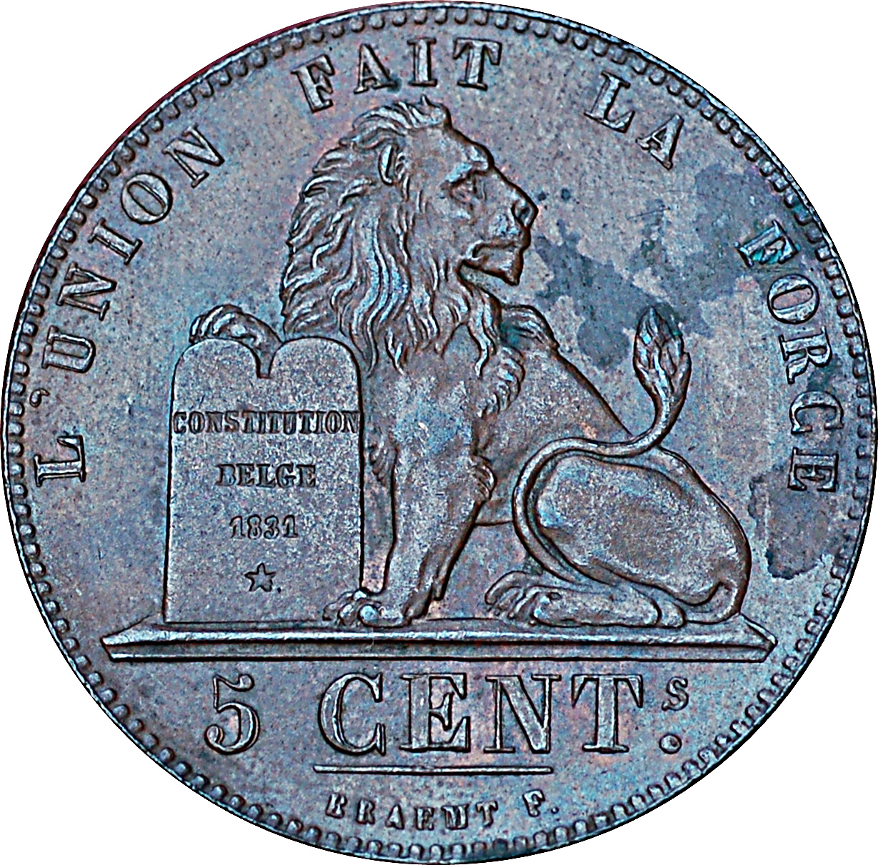 Опис: Лев, символ Бельгії, з лапою над Конституцією Бельгії 1831 року. Навколо — бельгійський девіз французькою мовою. Номінал і дизайнер вказані нижче.