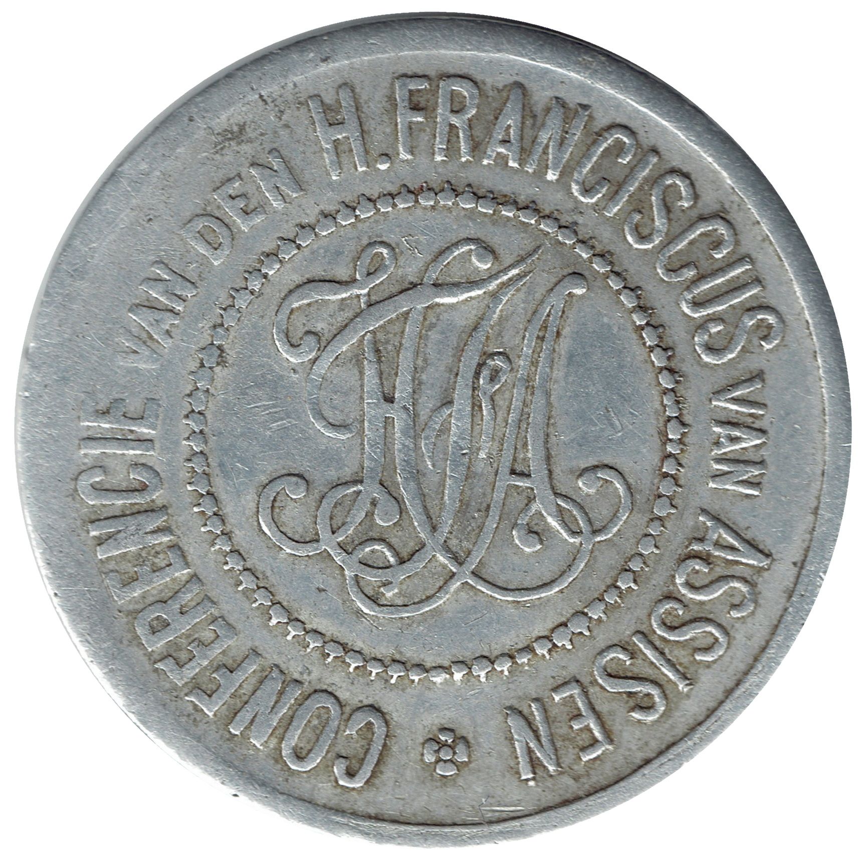 Між кільцем і краєм: «CONFERENCIE VAN DEN H. FRANCISCUS VAN ASSISEN», за яким йде квітка з чотирма пелюстками