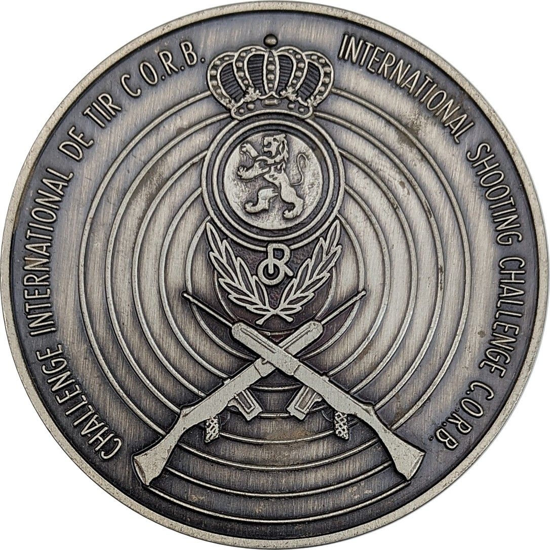 Опис: У центрі — дві схрещені долоні з ініціалами OR, зверху — бельгійський лев у короні, знизу — дві схрещені гвинтівки, на тлі — мішень. Навколо — легенда.