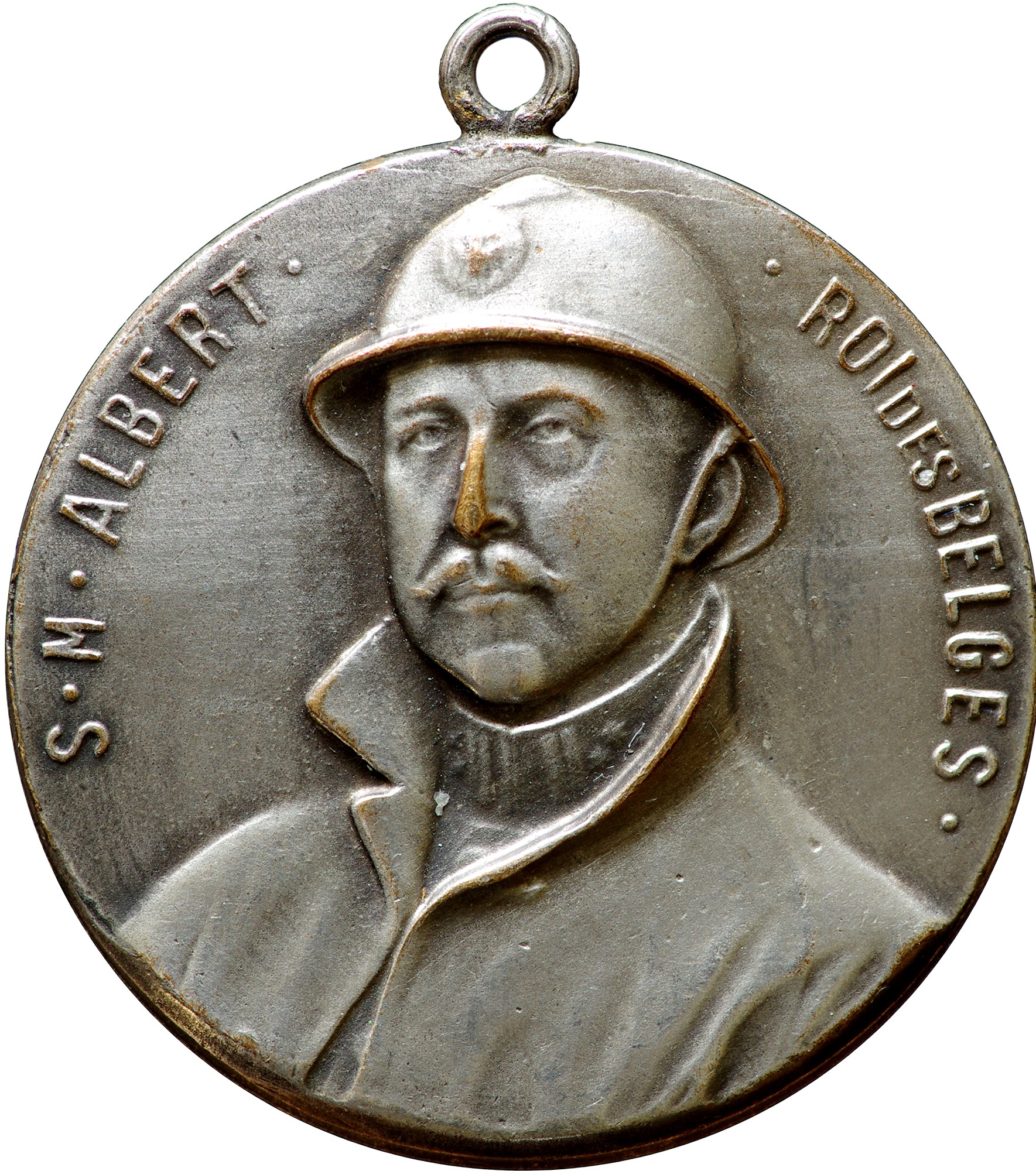 Опис: На аверсі зображено бюст короля Альберта I у військовій формі, сюртуку та бойовому шоломі.