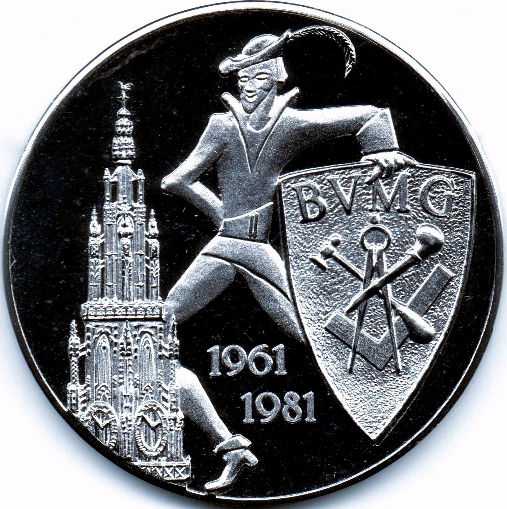 Опис: BVMG (на гербі) 1961/1981 (внизу між ногами Ланге Ваппера) Вежа собору Богоматері з Ланге Ваппером поруч, який тримає щит з граверними інструментами: циркулем, столярним кутником, граверним пером і молотком.