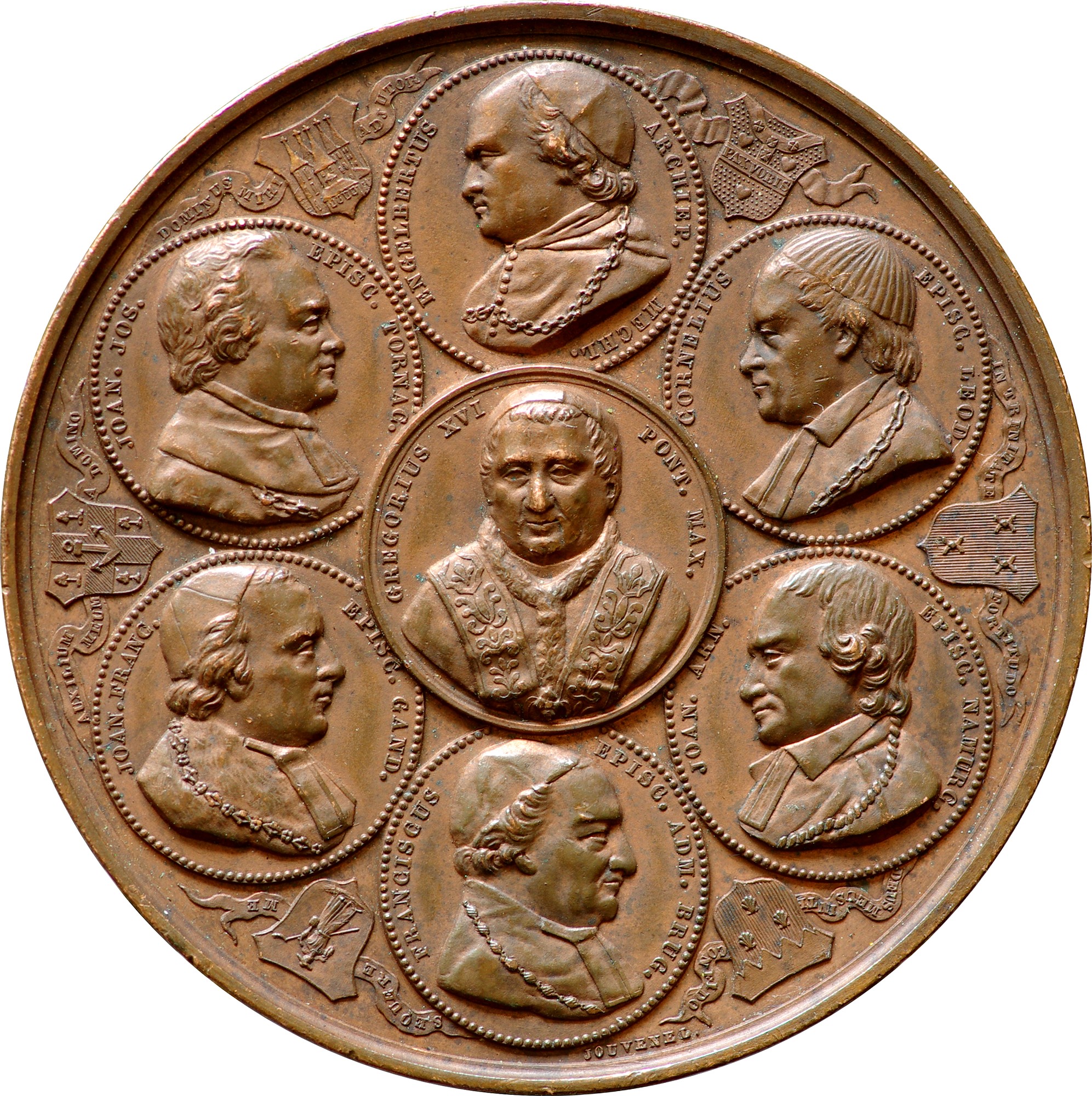 Опис: Портрети шести бельгійських єпископів 1834 року в медальйонах з облямівкою навколо центрального медальйона з зображенням Папи Григорія XVI