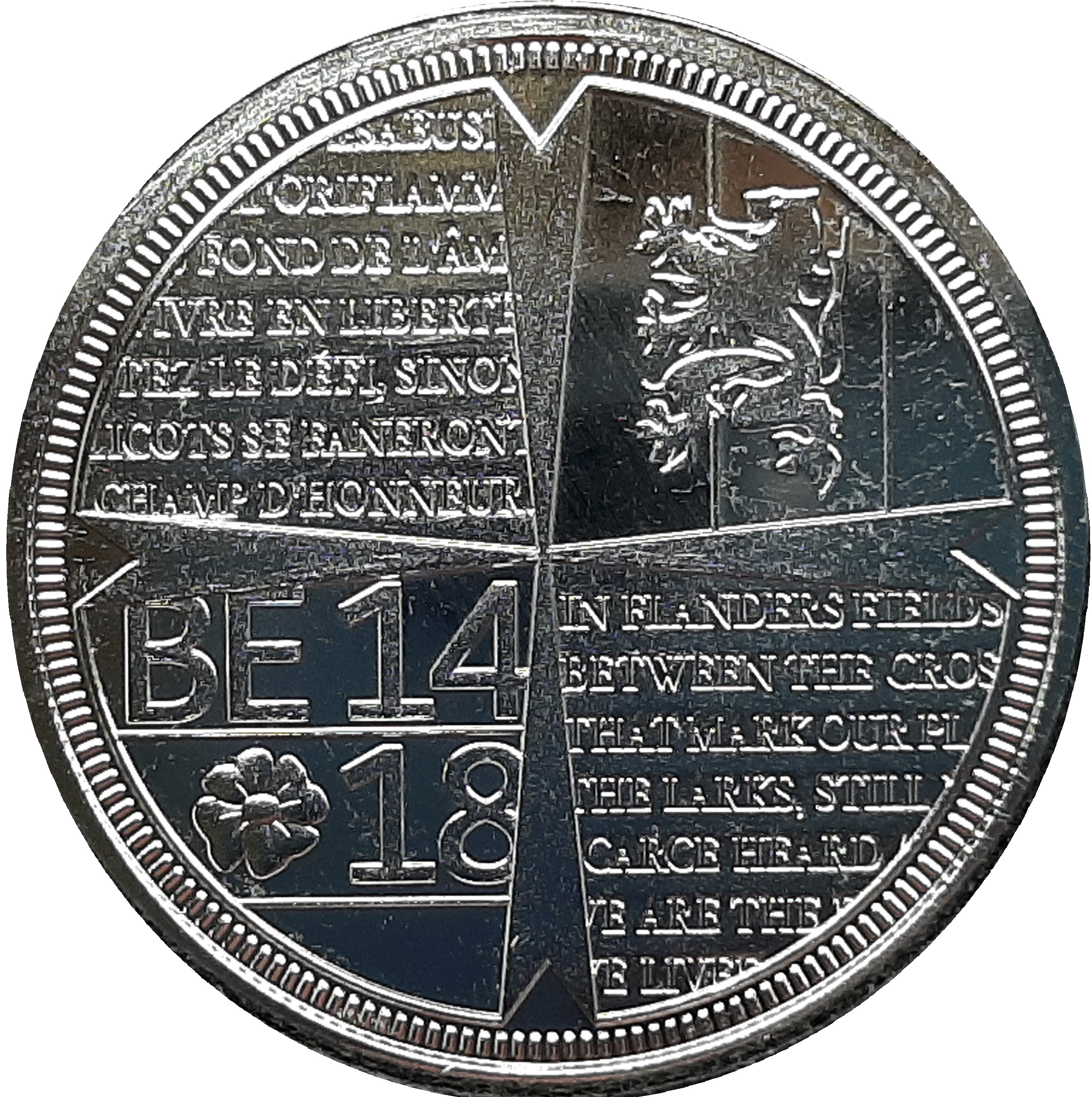 Опис: Зображення розділене на 4 частини. У верхньому лівому куті: частина третього куплета вірша «На полях Фландрії» французькою мовою. У верхньому правому куті: бельгійський лев. У нижньому лівому куті: BE 14 18 із зображенням маку. У нижньому правому куті: частина першого куплета вірша «На полях Фландрії» англійською мовою.
