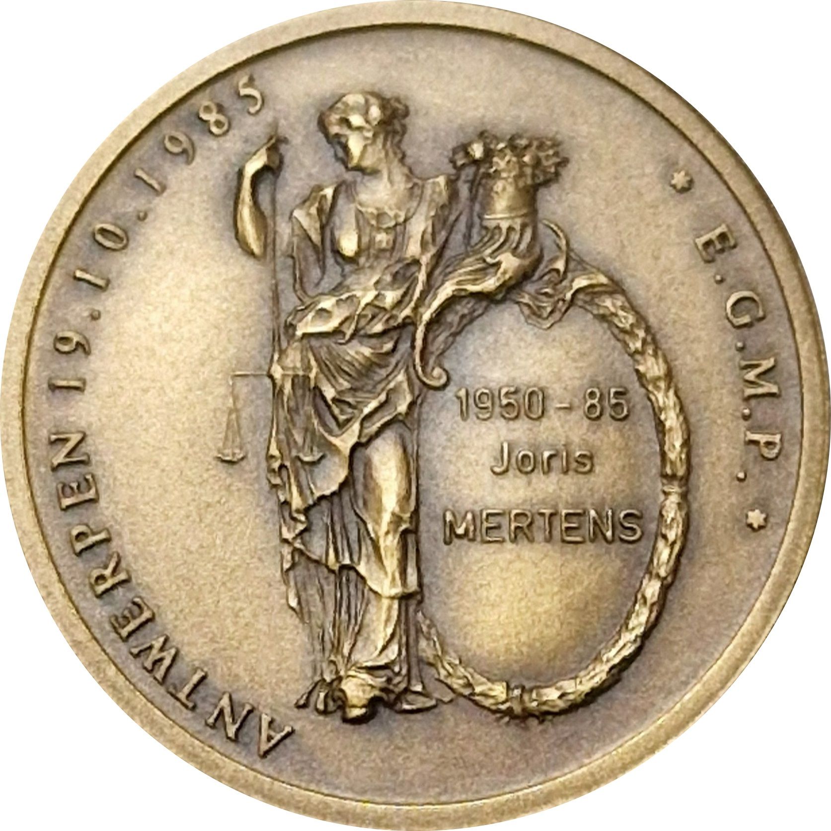 У правій руці вона тримає ваги, а в лівій — ріг достатку. Лівою рукою вона спирається на овальний щит, оточений лавровим вінком. На щиті: 1950-85 / Joris / MERTENS Навколо: ANTWERP 19.10.85 * E.G.M.P.*