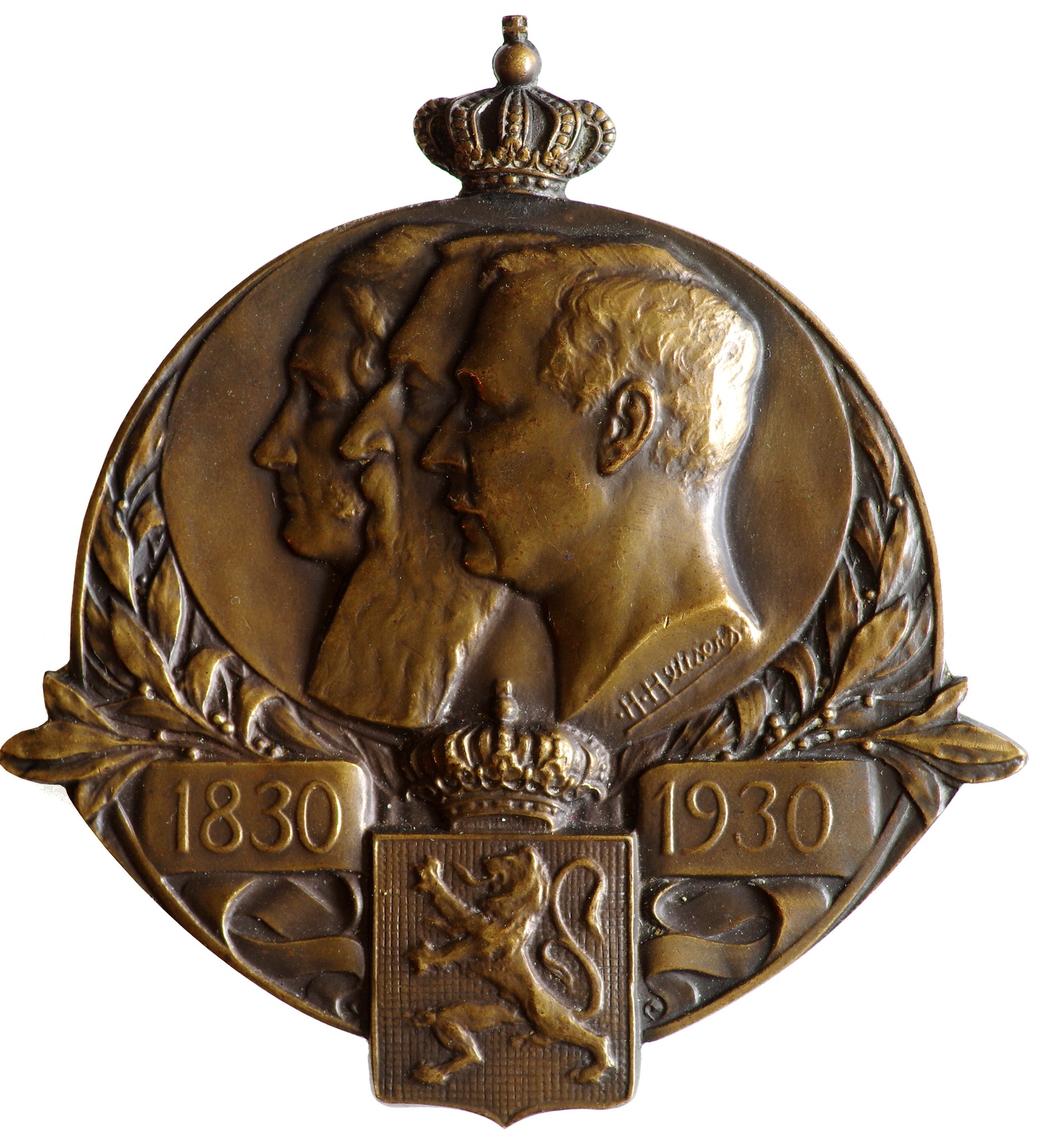 Опис: Медаль, увінчана королівською короною. В овальному колі, оточеному лавровими гілками, зображено лівий профіль перших трьох королів Бельгії. Нижче — коронований герб, що виходить за межі медалі внизу, інкрустований левом, що стоїть ліворуч на квадратному тлі.