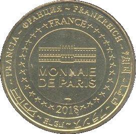 Опис: На периферії слово «Франція» написано вісьмома мовами. Франція на 12-й годині, 2018 рік на 6-й годині, все пов'язане 14 зірками праворуч і ліворуч. У центрі — будівля Моне-де-Парі.