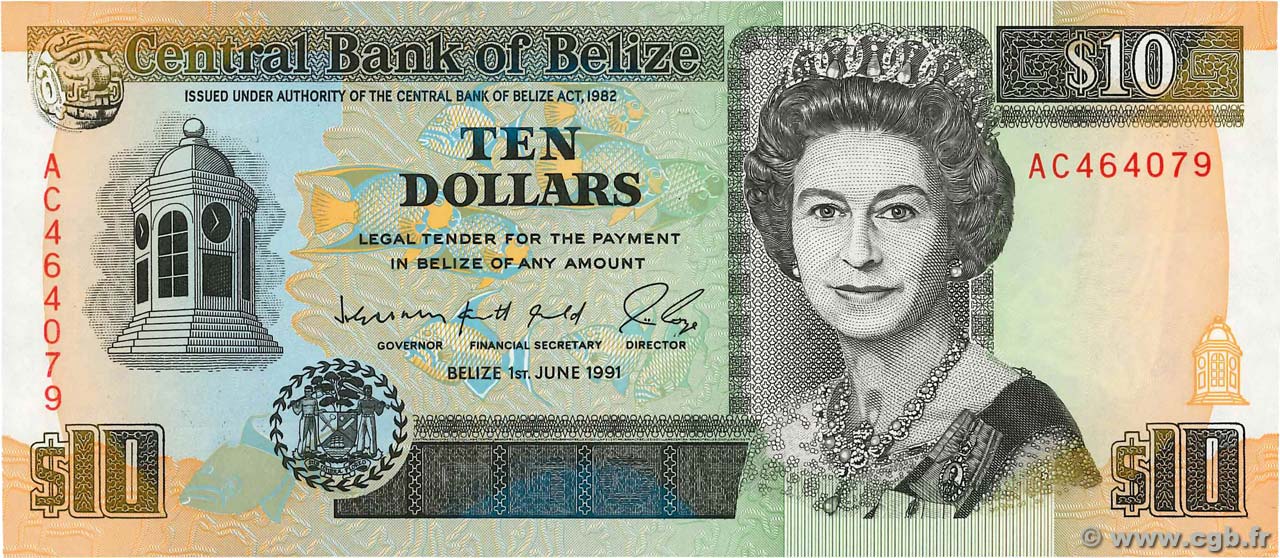 Опис: Чорний друк; багатоколірний піддрук; червоні серійні номери. Попереду в центрі праворуч зображено бюст королеви Єлизавети II в діадемі Володимира. Годинникова вежа будівлі суду міста Беліз ліворуч, королева-риба-спусковий гачок (Balistes vetula) та королева-риба-ангел (Holacanthus ciliaris) у центрі. Герб Белізу та срібна риба, звернена ліворуч, у нижньому лівому куті. Нефритове головне у верхньому лівому куті. Годинникова вежа будівлі суду міста Беліз, прозора деталь у нижньому правому куті.