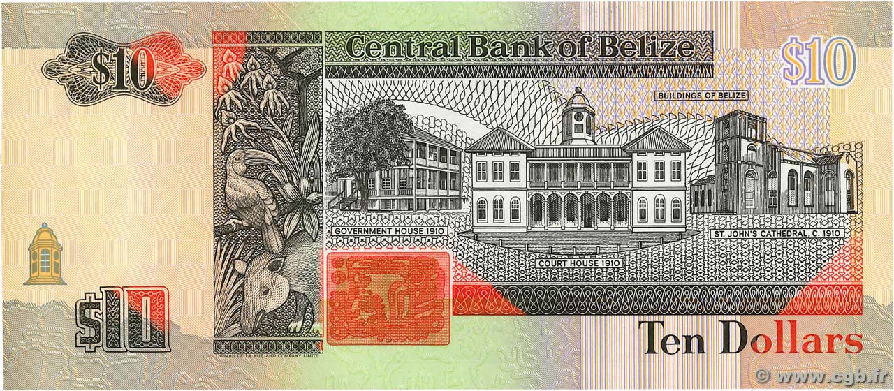 Опис: Чорний і червоний друк; багатоколірний піддрук. У центрі — Будинок уряду та Суд, праворуч — Собор Святого Іоанна. Тукан (Ramphastidae sp.) над тапіром Бейрда (Tapirus bairdii) у центрі ліворуч.