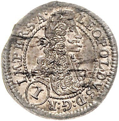 Опис: Праворуч портрет Леопольда I Габсбурзького з кучерявою перукою в колі, голова виходить за межі кола зверху, номінал внизу, легенда (початок 1h) навколо.