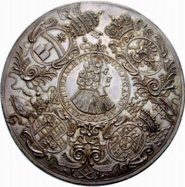 Опис: Невеликий бюст Вольфганга праворуч, навколо нього напис у простому внутрішньому колі; навколо та над більшою частиною поля — 4 прикрашені короною овальні щити з гербами Папи Римського, Імператора, Ольмютського абатства та родини Шраттенбах.