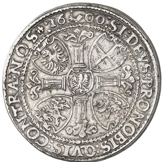 Опис: Квітковий хрест, герб Гогенцоллернів у центрі, невеликі оздоблені щити з гербами по кутах, дата, розділена символом монетного майстра у верхній частині.
