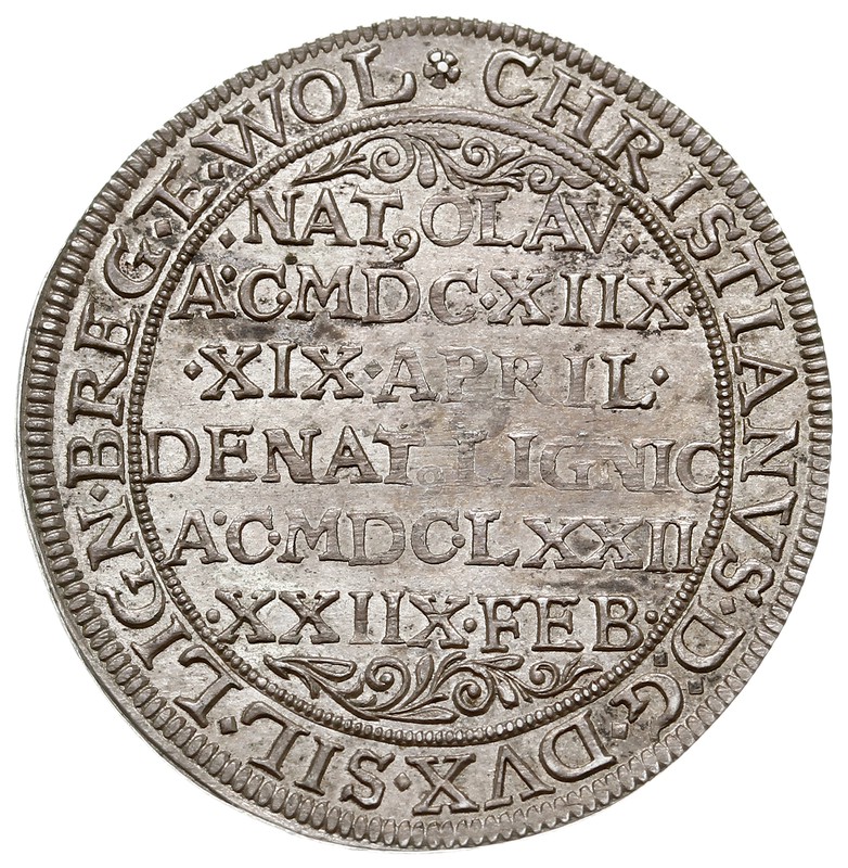 NAT. OLAV. / A. C. MDCXIIX. / XIX. APRIL / DENAT. LIGNICI. / A. C. MDCLXXII / XXIX. FEBR.