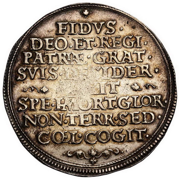 Опис: Броньований бюст із широким коміром з рюшами, праворуч у колі, невеликий щит із 4-кратним гербом, із центральним щитом знизу, 2 написи по краях із датами, позначеними римськими цифрами.