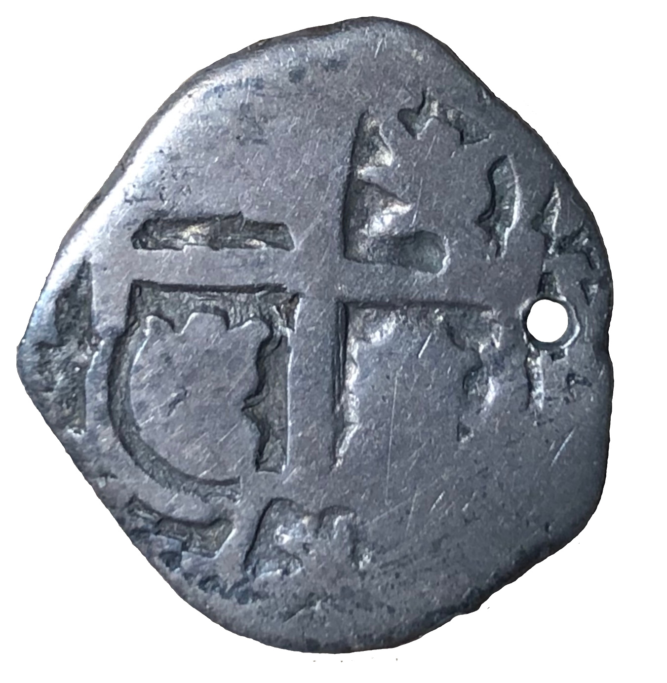 Cruz de Jerusalén, con dos leones y dos castillos, en cuarteles. Valor facial arriba, marca de ceca a la izquierda, inicial del ensayador a la derecha, fecha abajo.