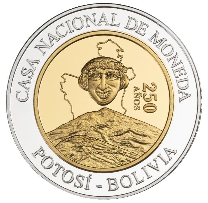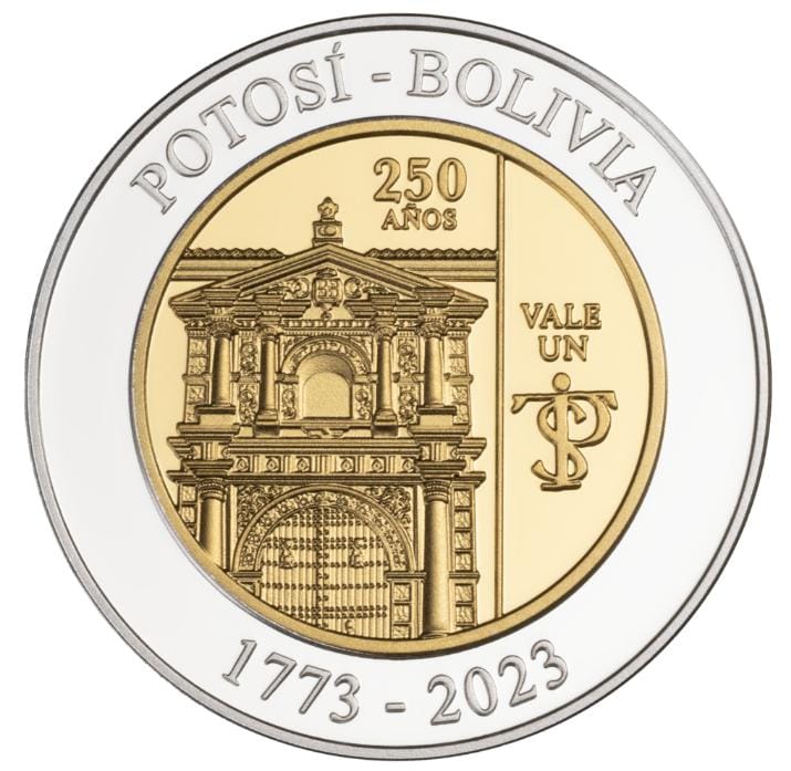 Опис: У центрі монети зображено фасад будівлі монетного двору Потосі, над ним напис «250 AÑOS», а поруч із будівлею — історичний знак монетного двору. Над зображенням монети розміщено напис «POTOSI — BOLIVIA», а під ним — «1773 — 2023».