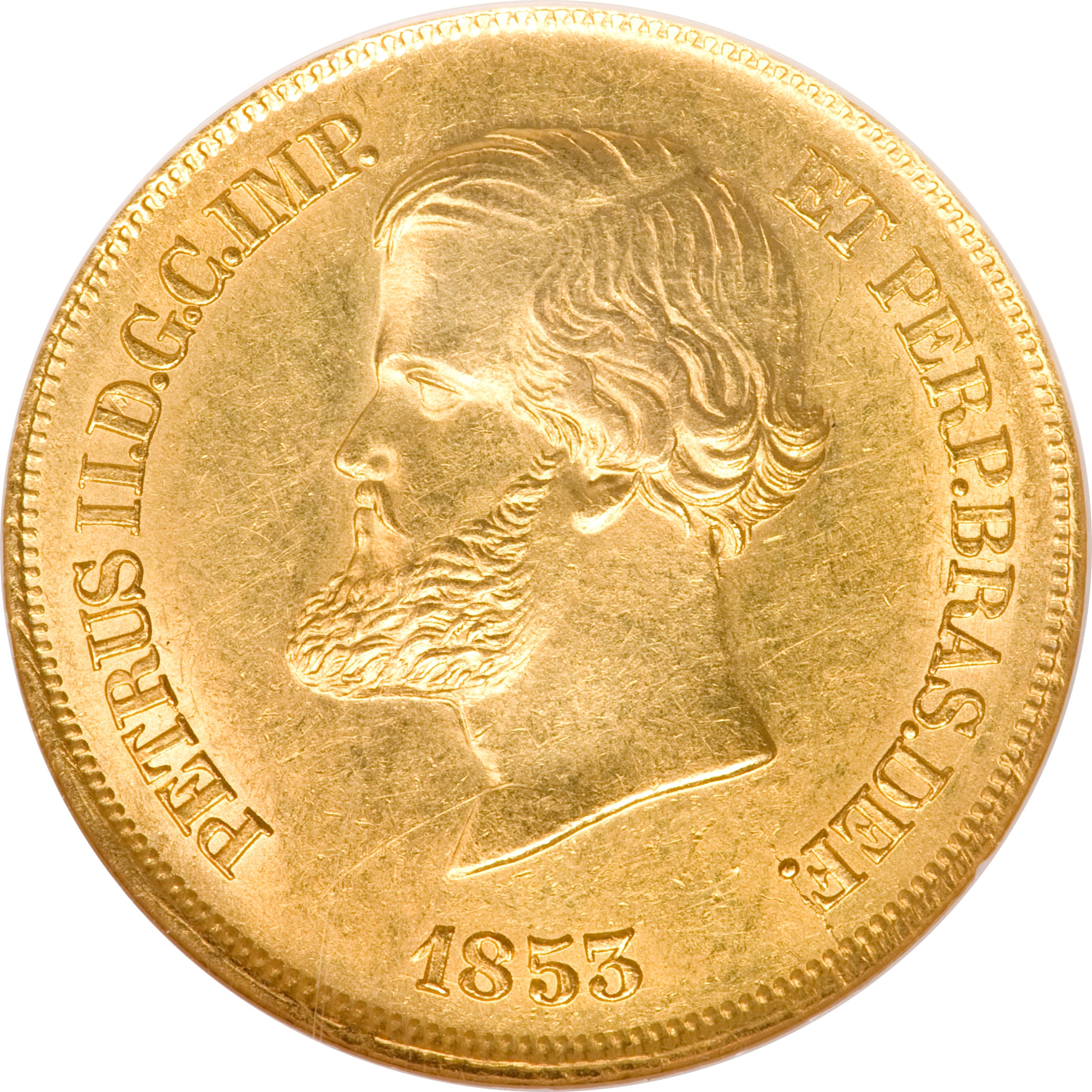 Опис: Голова Педро II ліворуч, зліва і справа від неї напис: PETRUS II.D.G.C.IMP. ET PERP.BRAS.DEF. Під головою вказано дату 1853 рік.