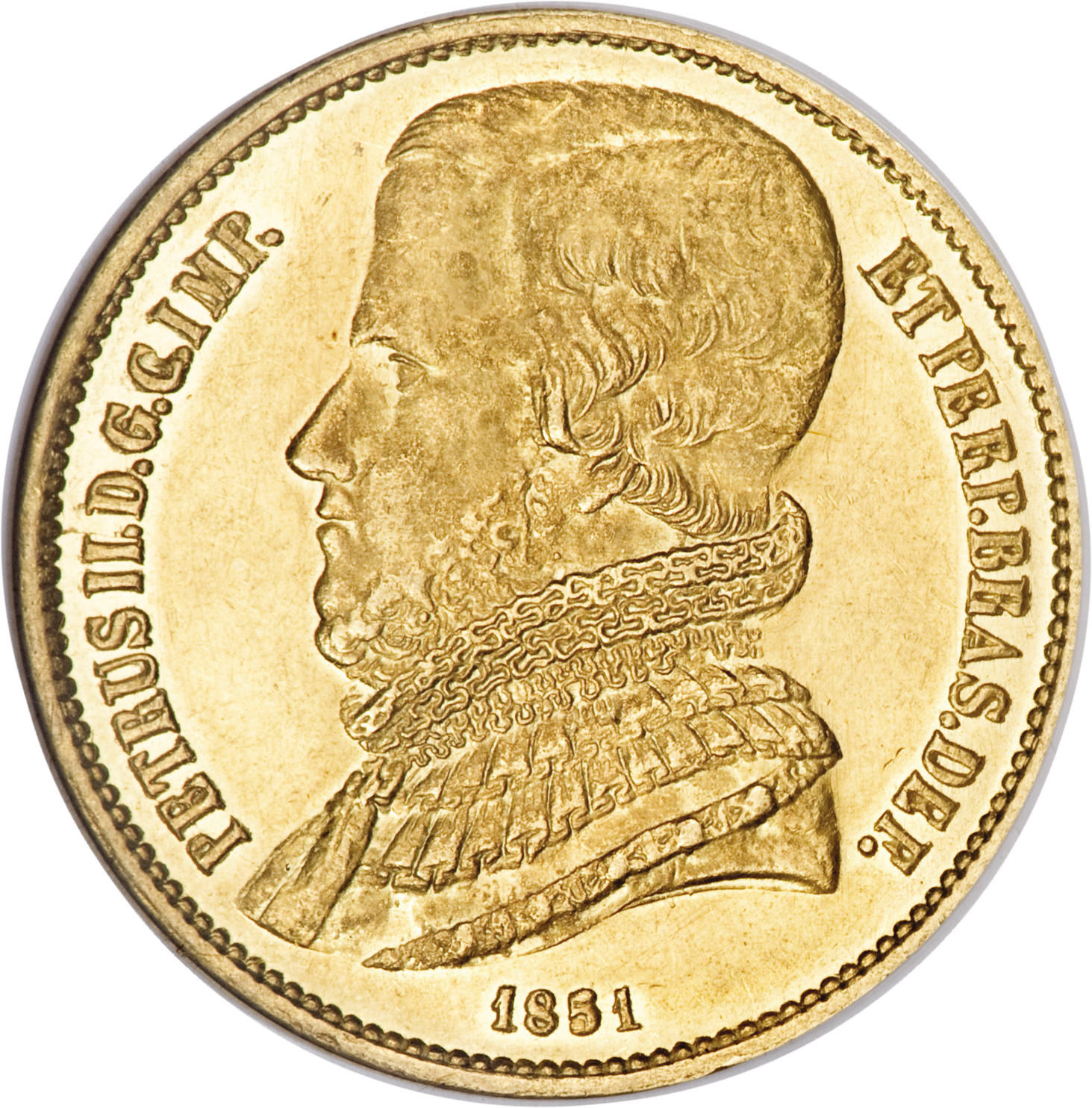 Опис: Ліворуч зображено бюст Педро II над датою 1851 року, а по боках — латинські підписи: PETRUS II.D.G.C.IMP. (ліворуч); ET PERP.BRAS.DEF. (праворуч).